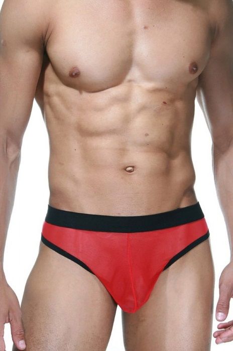 Мужские тонги из красной полупрозрачной ткани, с черным кантом и на широком черном поясе.