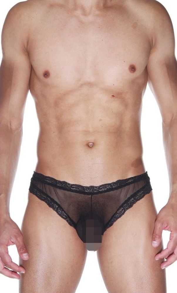 Черные мужские бразилиана из полупрозрачного легкого тянущегося материала. Кант из кружевной черной ленты.