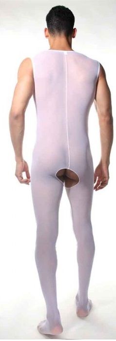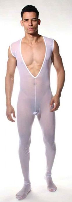Полупрозрачное боди-кэтсьюит для мужчин на все тело. У комплекта V-образный глубокий вырез, открытые ягодицы и широкие лямки.