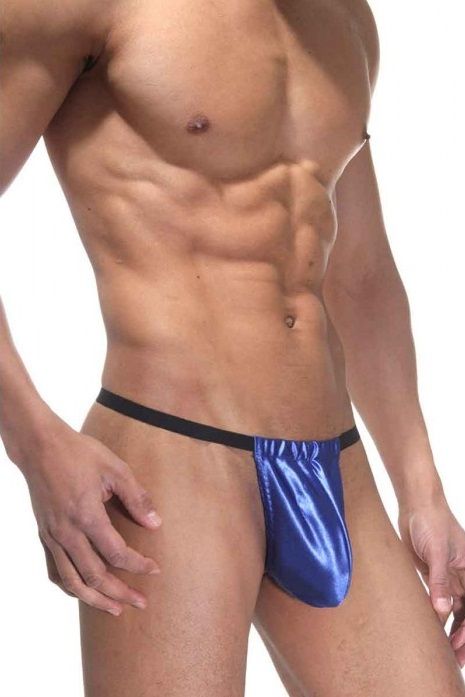 Трусы для мужчин на неширокой черной резинке и с синим сатиновым мешочком для мошонки.
