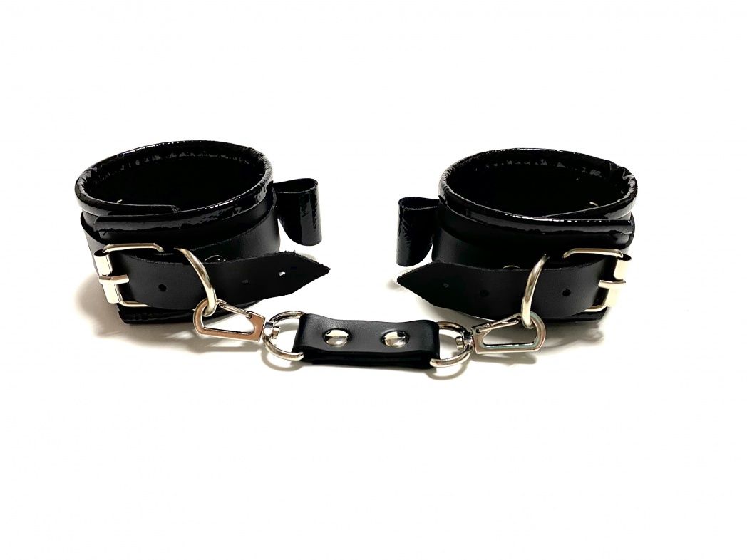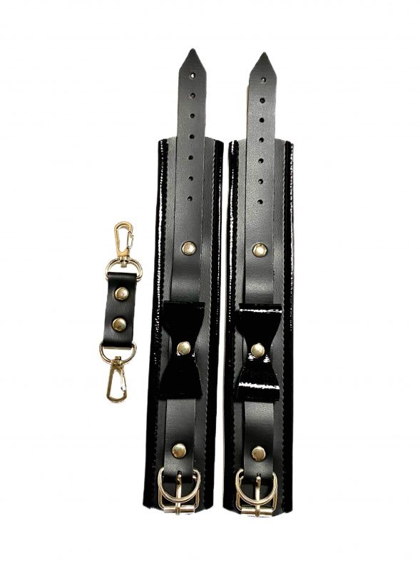 Красивые и функциональные наручники черного цвета, выполненные из искусственной кожи. Декорированы металлической фурнитурой, лаковыми бантиками и вставками по краям. Обхват удобно регулируется с помощью пряжек. В комплекте идет соединение с карабинами. Очень экономичный, экологичный и практически незаменимый аксессуар для вашей любовной игры! Ширина - 4,5 см. Длина соединения - 11 см.