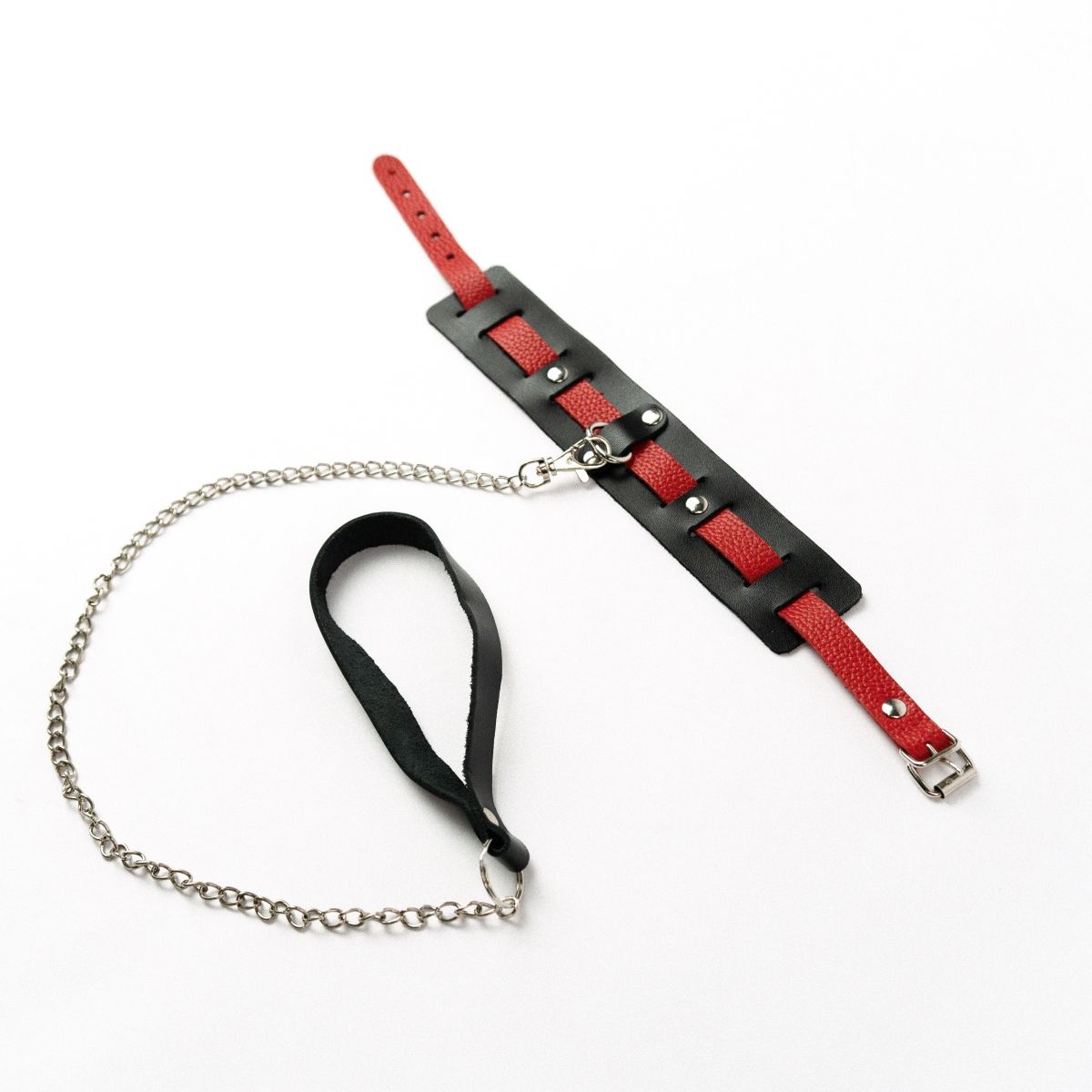 Ошейник имеет контрастную регулируемую вставку и металлическое крепление для поводка. Выполнен из натуральной кожи. Поводок из металлической цепочки снабжен удобной ручкой.