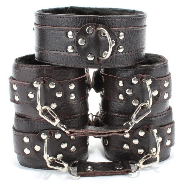 Набор аксессуаров коричневого цвета, изготовленных из натуральной кожи. В него входят: наручники и наножники, украшенные заклепками, которые можно соединять и комбинировать между собой при помощи цепей с карабинами (входят в комплект). Размер меняется при помощи застежки. Также имеется ошейник с одним кольцом. Размер регулируется застежками. Все атрибуты имеют внутреннюю меховую подкладку для комфортного использования. Ширина браслетов - 6 см. Ширина ошейника - 5 см. В комплекте: наручники с мехом, наножники и ошейник.
